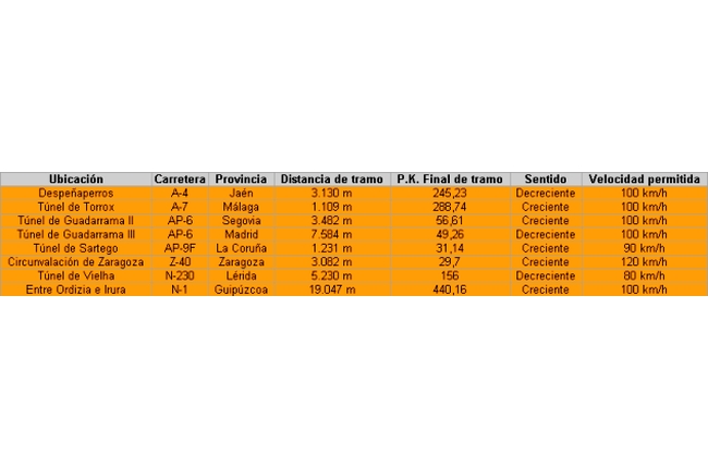 El primer radar de tramo en la red española se instaló en 2009 en el túnel de Vielha, Lérida, y en la actualidad un total de ocho controlan tantos tramos en distintas carreteras nacionales.