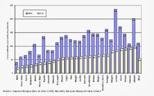 En este escenario, España ocupó en 2012 la séptima posición en el ranking de tasa de víctimas mortales con un valor de 41 fallecidos por millón de habitantes, por debajo de la media europea que es de 66.