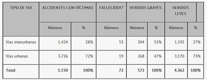 En las vías urbanas se produjeron 47.690 accidentes con víctimas, en los cuales fallecieron 461 personas (el 24% del total), 4.400 resultaron heridas graves y 57.510 heridas leves. Respecto del año anterior, el número de accidentes con víctimas ha crecido un 1%, el de fallecidos un 1% y el de heridos leves un 2%. Por contra, los heridos graves han disminuido un 3%.