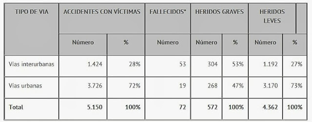 Los accidentes se produjeron mayoritariamente en vías urbanas (72%) donde también se producen la mayoría de los heridos leves ciclistas, el 73%. Sin embargo, el número mayor de ciclistas fallecidos se produjo en vías interurbanas, 53 de los 72 ciclistas fallecidos, sucediendo lo mismo en el caso de los heridos graves.