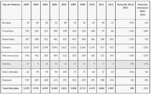 Durante  el año 2012, se produjeron en nuestro país  83.115 accidentes de tráfico con víctimas, en los que fallecieron 1.903 personas; 10.444 resultaron heridas graves y 105.446 heridos leves, lo que supone un descenso del 8% en el número de víctimas mortales.