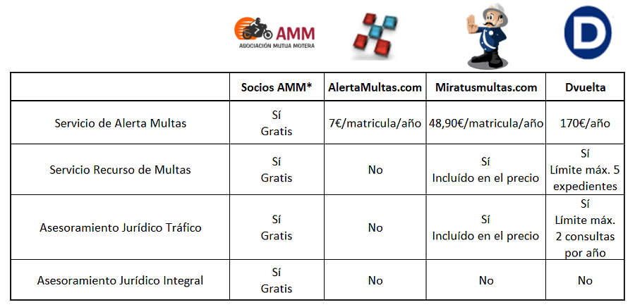 * A diferencia de los servicios prestados por las empresas de la comparativa, el servicio jurídico de alertas y asesoría de la AMM no está limitado a un número determinado de vehículos/matrículas, ni tiene límite máximo de consultas o expedientes. El servicio se presta al socio, con independencia del vehículo o vehículos que conduzca.