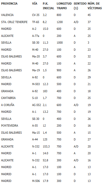 El ranking de tramos más peligroso los encabeza la carretera CV-35 localizada en Valencia. Son 800 metros de vía en los que se han producido 21 accidentes con 45 víctimas. El segundo tramo de 1.200 m se encuentra en el punto kilométrico 8,2 de la carretera tinerfeña TF-65, su saldo de víctimas asciende a 37 (11 fallecidas) en 21 accidentes. Finalmente el ranking de los tres más peligrosos se cierra con el punto kilométrico 15 de la A2 (Madrid), donde se contabilizan 19 accidentes y 25 víctimas mortales.